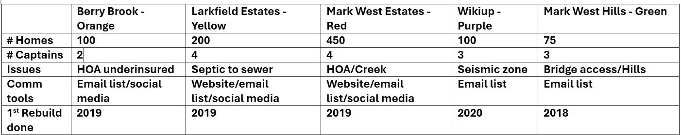 During the rebuild process, Sonoma County Supervisor James Gore created a Block Captain program. The program helped communicate rebuild information to neighborhoods within the Tubbs Fire zone of Supervisor Gore’s district. Below is a map of neighborhoods destroyed by the Tubbs Fire and where block captains were established.